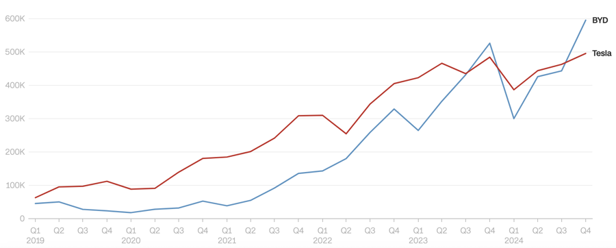 Năm 2024, BYD chiếm thị phần 32% trên thị trường xe năng lượng mới của Trung Quốc, bao gồm cả xe điện và xe hybrid. Tesla chiếm chỉ 6,1% thị trường này, dù đạt doanh số cao chưa từng thấy, theo số liệu của Hiệp hội Xe hơi Trung Quốc (CPCA).